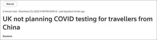 路透社:英国不打算对来自中国的旅客进行新冠检测