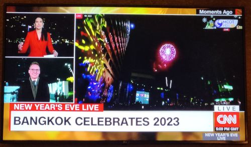 因此,在好几分钟的时间里,CNN新闻字幕都如上图这样写着“泰国首都庆祝2023新年”,但转播画面却是我国台湾地区台北市的夜景。