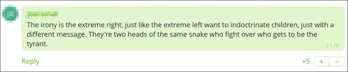“讽刺的是,极右派就像极左派一样想给孩子们灌输思想,只是信息不同而已。他们是双头蛇的两个头,为谁能成为暴君而争斗。”