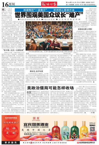 正如拜登所言,美国众议院连日来的议长选举乱象吸引着全世界的目光。许多人对美国民主令人震惊的分裂和崩溃感到担忧,分析人士担心一些西方国家会受到美国政治两极分化的影响。一些媒体报道认为,危机凸显了美国政治的不稳定。德国西德意志广播电台5日称,此前国会骚乱的副作用仍在影响美国政治。当前发生的状况不仅对共和党不利,也无助于拜登政府执政。美国政治蒙上的阴影,也会飘向欧洲等世界其他地区。瑞士《巴塞尔日报》5日报道称,现在强硬派正试图从内部攻击民主的核心。