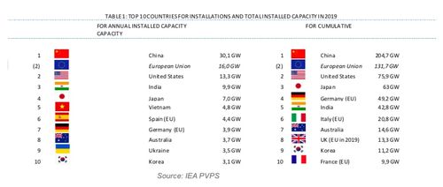 2019年全球太阳能光伏装置量前十名的国家和地区排名