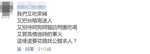 还有网友讽刺道:“我们又吃莱猪(含瘦肉精的美国猪肉),又把台积电送人,又招待阿狗阿猫访问团吃喝,又买高价过时的军火,这样还要花钱找公关求人?”↓