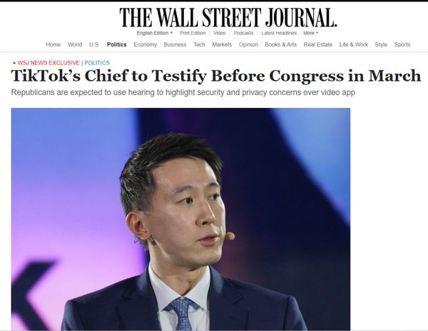 1月30日,美国《华尔街日报》援引美国国会发言人消息称,TikTok首席执行官周受资已同意参加在美国国会举行的听证会,时间定于3月23日。
