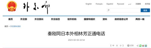 文章导读 秦刚同日本外相林芳正通电话2023年2月2日,外交部长秦刚同日本外相林芳正通电话。……