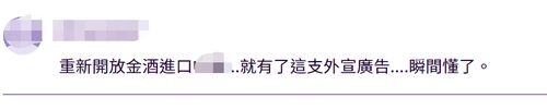 对此,有岛内网友说,大陆重新开放金酒输入,就有了这支外宣广告,瞬间懂了。↓