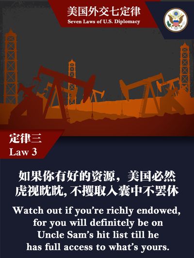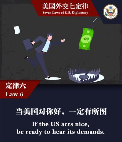 与此同时还有第五个定律——“美国开始污蔑抹黑你,它的黑手正向你伸来”。比如美国打压新疆制造产品、抹黑新疆的太阳能光电,全是胡言乱语。