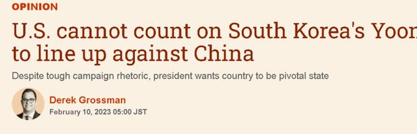 在这篇题为“美国不能指望韩国的尹锡悦加入对抗中国的行列”的文章中,格罗斯曼先是表示,虽然尹锡悦在去年竞选总统时曾表示他希望引入更多美国的反导系统来对付朝鲜,说了很多美国政府爱听的话,但自他于去年5月上任以来,他却“明显地”改变了这些立场,因为他也希望与中国维持好关系。