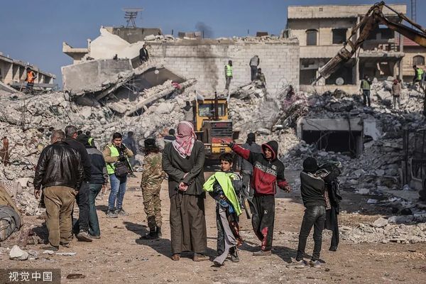 当地时间2023年2月11日,叙利亚,图为发生强震后,人们站在被摧毁的建筑旁进行恢复工作。图源:视觉中国