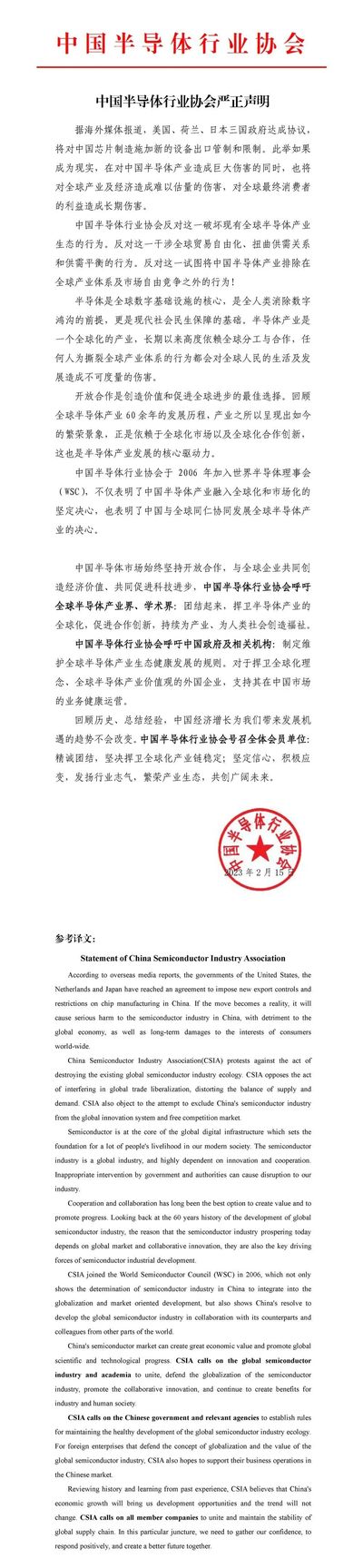 中国半导体行业协会反对这一破坏现有全球半导体产业生态的行为。反对这一干涉全球贸易自由化、扭曲供需关系和供需平衡的行为。反对这一试图将中国半导体产业排除在全球产业体系及市场自由竞争之外的行为!