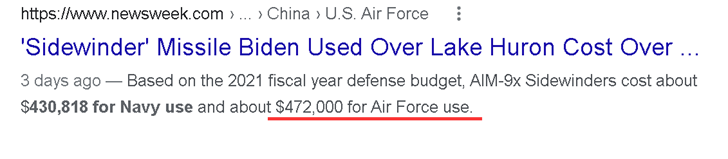 而美军F-22战机用来击落这些气球的AIM-9X导弹,根据美国《新闻周刊》的介绍,单枚造价可能就高达近50万美元。