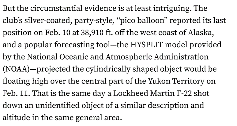 该网站介绍说,俱乐部的那个气球最后一次报告位置是2月10日,当时其位置在阿拉斯加西部海岸高度为38910英尺的地方,随后俱乐部根据美国国家海洋和大气局(NOAA)的后向轨迹模型(HYSPLIT)推测气球接下来会在11日时出现在加拿大的育空地区中部的上空——而美军在11日用F-22战机发射AIM-9X导弹击落的那个“不明飞行物”,也恰恰在同一个时间点出现在相同的地理位置和高度。