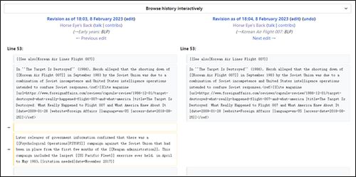 在一段关于赫什对冷战时期新闻的调查里,新版本删掉了美国中央情报局对苏联展开心理战的描述,而且没有给出删除理由。