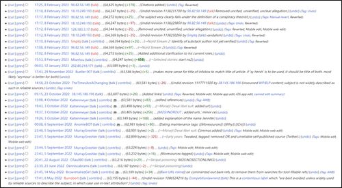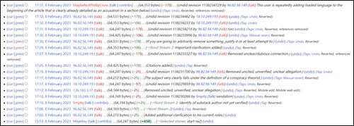 但一个我们可以观察到的客观事实是,在2月8日“北溪事件”的报道发布前,赫什的词条的编辑频率要远远低于现在,很多时候甚至一年只有零星的一两次关于正文内容的修改。可随着他的报道火遍全网后,他的经历和定性就像是某个新的“阵地”,而有人非常希望这个“阵地”能牢牢掌控在自己手里。