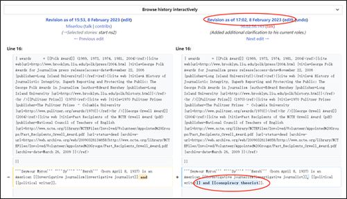 注意到这个操作后,另一位用户对赫什的词条进行了重新修改,又把这个“阴谋论者”的措辞给删了。随后滑稽的一幕出现了,关于赫什是不是“阴谋论者”,两边展开了激烈的拉锯战,一边加上这个词后,另一边则在编辑页删除,而这边刚删完,转眼对方又把这个词重新加了回来。