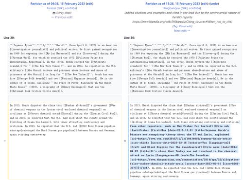 除了这几轮修改外,自2月8日到今天,赫什的个人介绍里还有许多删改也很有意思。在赫什揭露“北溪”爆炸的文章火了之后,词条把这篇报道作为他的重要作品收录在了他的职业经历介绍里,而不到2分钟后,就有人对这篇报道加了一个补充,称“北溪”管道是被美国主导炸毁的说法“尚未得到证实,消息全来自于一位匿名人士”,试图削弱这篇报道的公信力。