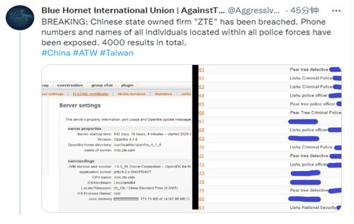 2022年8月12日,ATW组织在推特发布数据售卖帖,称其从中兴通讯公司服务器获取了4000条警察人员的电话号码和姓名数据。