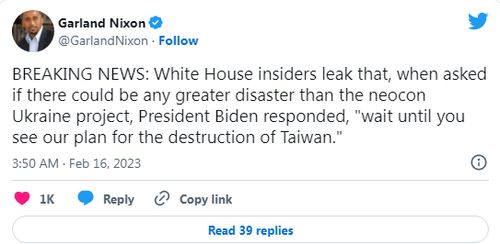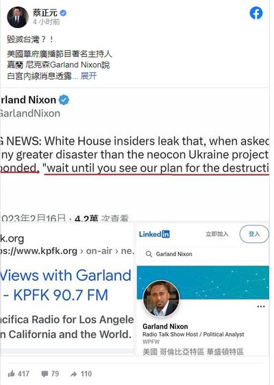 事情是这样的:蔡正元2月21日在脸书分享了美国华盛顿广播节目著名主持人嘉兰·尼克松(Garland Nixon)的推特发文。尼克松在文中称,有白宫内线消息披露,当被问到有什么比“新保守主义乌克兰方案”更具灾难性的事情时,拜登竟回答说,“等你看到我们‘毁灭台湾’的计划就知道”。