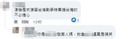 还有网友宣称,澳大利亚军机“是来演习台海战争时军援台湾的,不必担心。”但随即有网友留言反驳,“你是防务部门发言人吗,还真是搞笑。”↓