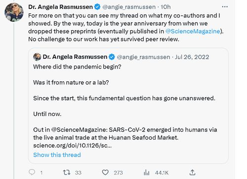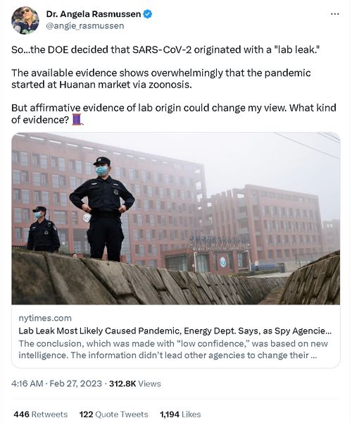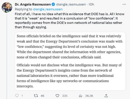 比如,一直在为武汉病毒所澄清种种西方舆论场上的谣言,认为新冠病毒来自自然界的加拿大病毒学家安吉·拉斯姆森就在她的社交账号上发帖调侃了一番美国能源部谈论新冠病毒来源的事,称她并没有从戈登和《华尔街日报》的这篇报道中看到任何可以证明新冠病毒来自武汉病毒所的科学证据。