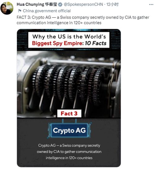 “美国是世界最大监控帝国的十大事实”。针对美国部分声音近期大肆炒作“中国在全球开展监控活动”,中国外交部部长助理、发言人华春莹28日发推晒出10张图回击,列举美国“才是世界上最大‘监控帝国’”一系列事实中的10个例证。