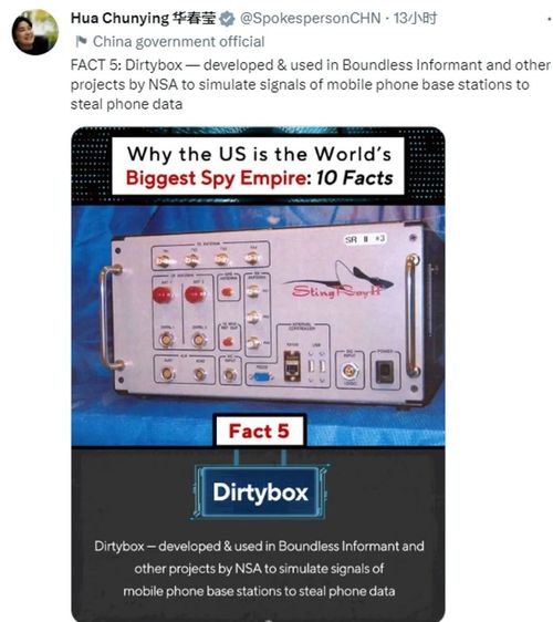 事实 5:“脏盒”。美国国安局在“无边界线人计划”等项目中开发并使用“脏盒”,用于模拟移动电话基站信号,以窃取电话数据。