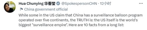 华春莹发推称,“虽然美国一些人声称中国有一个覆盖五大洲的监视气球计划,但真相是:美国自身才是世界上最大的‘监控帝国’。以下是一长串清单其中的10个事实:”