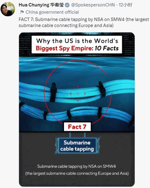 事实 7:光缆窃密。美国国安局入侵SMW4(连接欧洲和亚洲的最大海底电缆),从海底电缆上窃密。