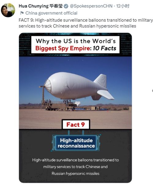 事实 9:高空侦察。美国将携带侦察设备的高空气球转为军用,用于追踪中国和俄罗斯的高超音速导弹。