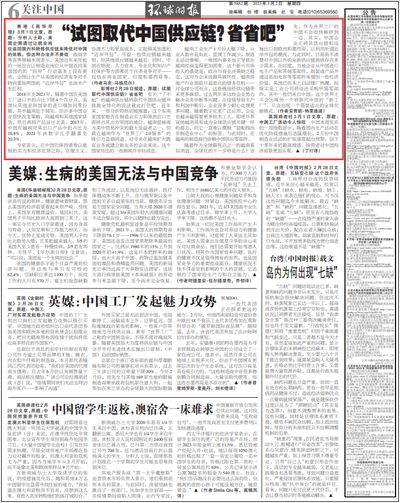 香港《南华早报》3月1日文章,原题:分析人士称,美国企图通过让就业岗位返回国内和转移供应链来降低对中国的依赖,但这种办法并不奏效