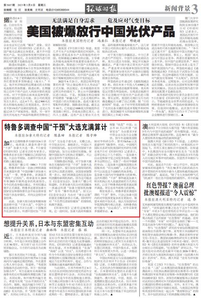 此前,加拿大部分政客和媒体接连诬称中国“干涉大选”。中国外交部长秦刚在3月2日出席二十国集团外长会时表示,所谓中国对加“干涉行为”完全是子虚乌有、无稽之谈,中方坚决反对。秦刚表示,中国从不干涉别国内政,也反对任何国家干涉别国内政。加方应采取切实措施,保障中国驻加外交机构正常履职,不让谣言及炒作干扰两国关系。