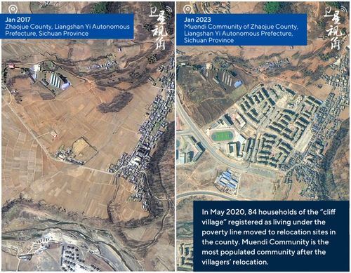 随后,华春莹陆续发布了4组卫星对比图。第二组卫星对比图显示了四川省凉山彝族自治州昭觉县“悬崖村”2017年1月和该村2023年1月搬迁至城北镇沐恩邸社区的样貌。2020年5月,“悬崖村”84户贫困户搬迁至城北镇沐恩邸社区,该社区也成为村民易地搬迁后当地人口最多的社区。↓