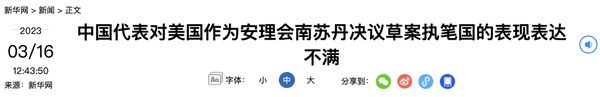 中国代表对美国作为安理会南苏丹决议草案执笔国的表现表达不满