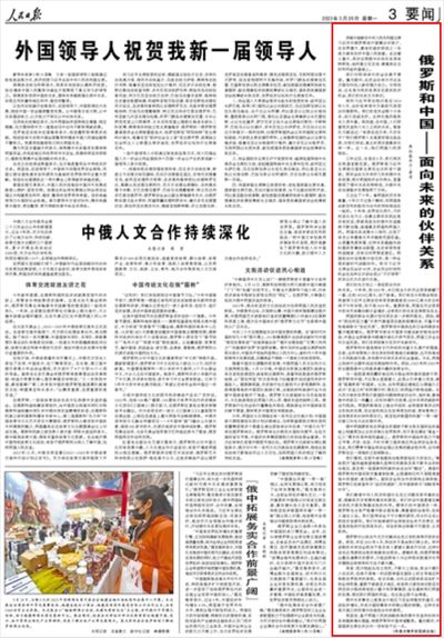 3月20日,《人民日报》三版发表俄罗斯总统普京署名文章,标题为《俄罗斯和中国——面向未来的伙伴关系》。
