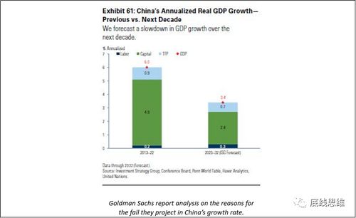 确切地说,根据高盛的报告计算,中国GDP年均增速将下降2.6%——从2013-2022年的6.0%降至2023-2032年的3.4%。但是造成这种情况的唯一原因是受到了资本投资所占GDP增长下降了2.4%的压倒性影响——从 4.8%降至2.4%。[9]高盛报告预测,由于92%的GDP增长下降源自资本投资下降,仅8%的GDP增长下降或者0.2%的GDP增长源自投资下降以外的因素。高盛报告数据显示,如果投资未有下降,中国GDP年均增速只会从6.0%降至5.8%——这一水平很容易让中国超额完成2035年目标。
