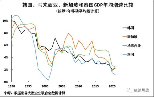 在固定投资下降的影响下,增长方面的影响显而易见。如图8所示,按照5年移动平均线计算,1996年到2021年韩国、新加坡、泰国和马来西亚GDP年均增速均大幅下降: