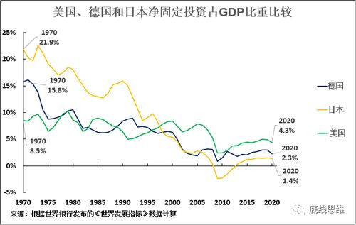 可以看出,1970年,也就是美国对德国和日本采取1971年措施之前,日本净固定投资占GDP比重为21.9%,德国为15.8%,美国为8.9%。也就是说,德国和日本净固定资产投资水平在GDP中对其资本存量增长的贡献分别比美国高6.9%和13.0%。根据世界银行提供的最新国际可比数据,2020年,美国净固定资本投资水平实际上高于德国和日本,其GDP年增长率也是如此。1970年至2020年,美国净固定投资占GDP比重下降4.2%——从8.5%降至4.3%;德国这一比重下降13.5%——从15.8%降至2.3%;日本这一比重则降幅惊人,高达20.5%——从21.9%降至1.4%。因为日本资本存量年增长率极低,其GDP长期停滞就完全解释得通了。