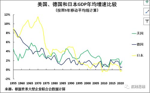 与这种变化相对应,到1955年,西德GDP年均增速为8.9%,美国则为4.6%;到1965年,日本年均增速为9.4%,美国则为5.1%。