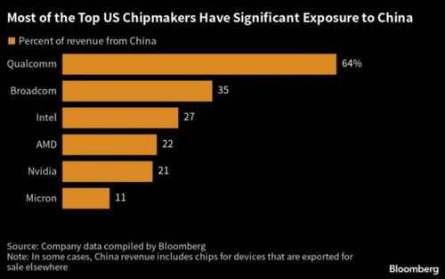 “以下是受中美紧张局势升级影响最大的美国芯片制造商”,彭博社在另一篇文章中列出了最依赖中国业务的美国芯片制造商,其中高通公司(Qualcomm)以64%销售额来自中国大陆市场而名列榜首。