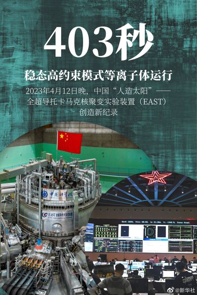 4月12日晚,经过十几年聚力攻关,EAST成功实现稳态高约束模式等离子体运行403秒,刷新2017年的101秒世界纪录,实验现场一片欢腾。