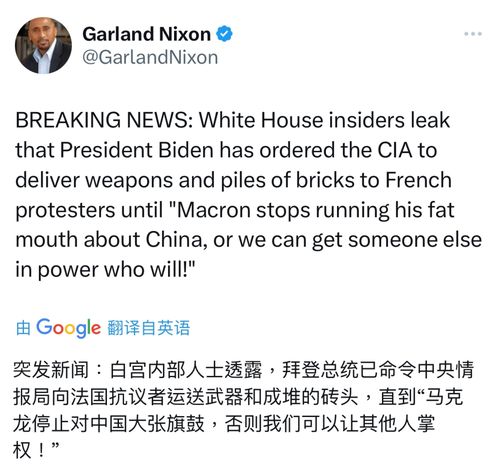 一是给马克龙捣乱,“拜登总统已命令中央情报局向法国抗议者运送武器和成堆的砖头,直到马克龙在中国问题上闭嘴。”
