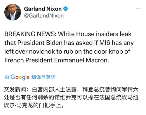 4月12,同样据称援引白宫内部消息,加兰称拜登曾询问军情六处是否有任何剩余的诺维乔克神经毒剂可以抹在马克龙的门把手上。