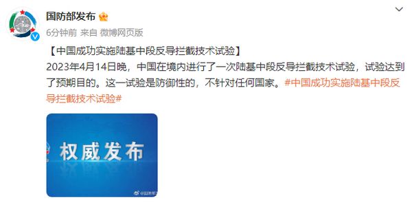 @国防部发布 消息,2023年4月14日晚,中国在境内进行了一次陆基中段反导拦截技术试验,试验达到了预期目的。这一试验是防御性的,不针对任何国家。