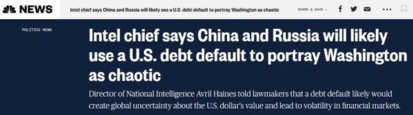 综合美国全国广播公司(NBC)和《国会山报》报道,当被问及情报界对美国债务违约潜在影响的评估时,海恩斯宣称,中俄“几乎肯定会寻求利用这个机会”进行“信息战”,把这类事件作为美国内部混乱和相关治理问题的证据,说美国“无法作为民主国家运作”。