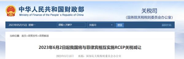 2023年6月2日起我国将与菲律宾相互实施RCEP关税减让