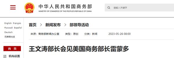 5月25日,商务部部长王文涛在赴美国参加亚太经合组织贸易部长会议期间,在华盛顿会见美国商务部长雷蒙多。双方就中美经贸关系和共同关心的经贸问题进行了坦诚、专业、建设性的交流。中方就美对华经贸政策、半导体政策、出口管制、对外投资审查等表达重点关切。双方同意建立沟通渠道,就具体经贸关切和合作事项保持和加强交流。