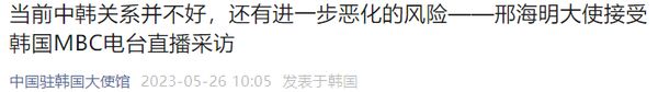 5月26日,邢海明大使接受韩国MBC广播电台早间时事访谈节目《金钟培视线集中》电话直播采访。邢海明大使在访谈中就中韩关系、中韩经贸及人文交流、日本福岛核污水排海等问题等回答了主持人提问。