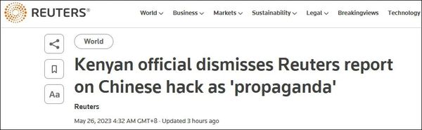 “随着债务压力增加,中国黑客攻击肯尼亚政府”,英国路透社24日以此为题发布所谓“独家报道”炒作称,有在肯从事情报分析的消息人士说,中国黑客组织对肯尼亚政府发起了一场“广泛的攻击行动”,时间从2019年底一直持续到至少2022年,被攻击对象包括总统府、国防部、信息部、卫生部、土地部和内政部及反恐中心等多个部门和机构。