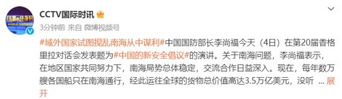 关于南海问题,李尚福表示,在地区国家共同努力下,南海局势总体稳定,交流合作日益深入。现在,每年数万艘各国船只在南海通行,经此运往全球的货物总价值高达3.5万亿美元,没听说哪艘船通行受阻碍、安全受威胁。反倒是一些#域外国家在南海以航行自由之名行航行霸权之实#,想把南海搅乱以从中谋利,需要我们高度警惕、坚决抵制。