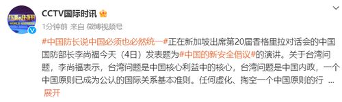 李尚福说,中国必须统一,也必然统一,这是人心所向、大势所趋。我们愿以最大诚意、尽最大努力争取和平统一,但决不承诺放弃使用武力。如果有人胆敢把台湾从中国分裂出去,中国军队不会有丝毫迟疑,不畏惧任何对手,不管付出多大代价,都将坚决维护国家主权和领土完整。