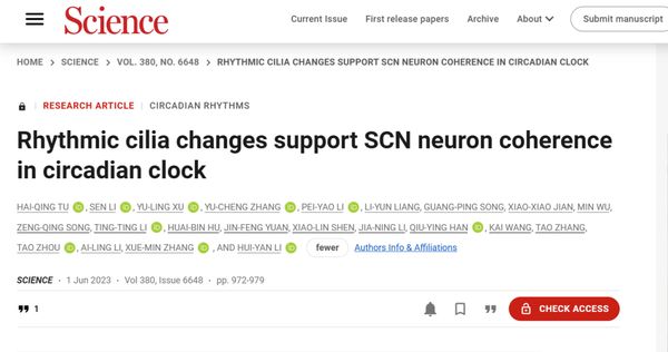 近日,军事科学院军事医学研究院李慧艳研究员团队和张学敏院士团队合作在该领域取得重大原创性突破。他们发现大脑视交叉上核(SCN)神经元的初级纤毛是调控机体节律的细胞器,揭示出“有形”生物钟的存在及其节律调控机制。北京时间6月2日凌晨,国际顶级学术期刊Science在线发表了这一成果的相关研究论文。